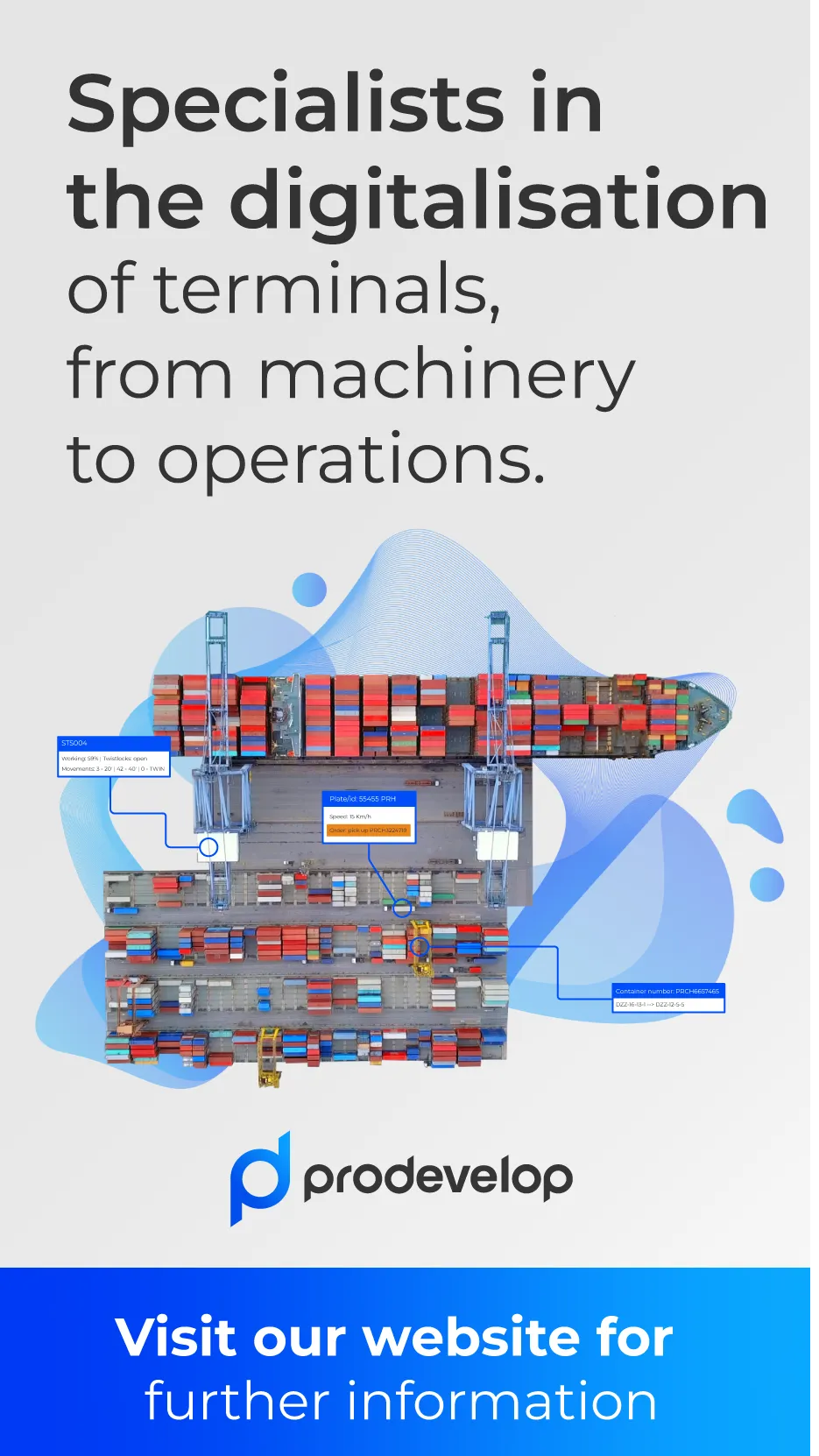 Prodevelop is a software company specialised in ports and terminals digitalisation that has a technological alliance with 200+ ports and terminals worldwide. With thirty years of collaboration on innovative projects, they offer their clients cutting-edge technology to transform their business through digitalisation, solving complex problems and differentiating them from their competition.